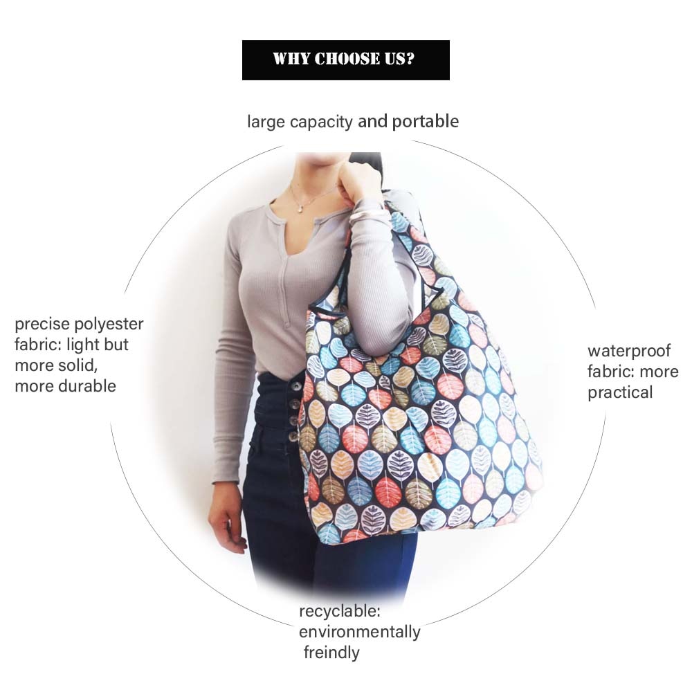 1. Large capacity and portable; 2. Precise polyester fabric: light but more solid, more durable. 3.Waterproof fabric: more practical. 4.Recyclable: environmentally freindly.